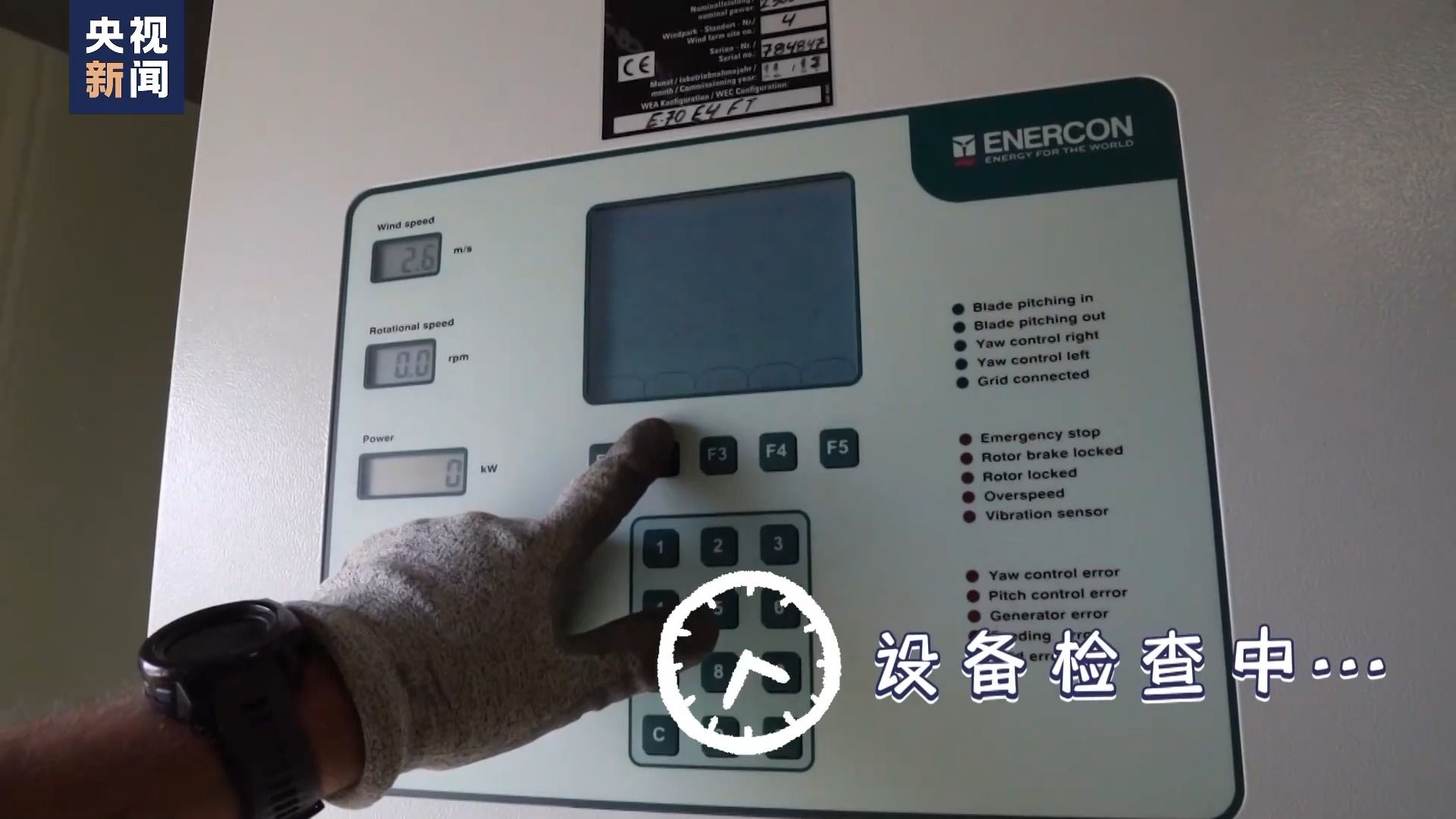 国家能源集团欧洲新能源公司安全总监 乌巴特:这台就是我们出现变频器高温故障的这台风机。你看到这个开关,它正常的运行状态应该是一个竖的位置,现在它已经到了这样一个位置,是开关已经跳开了,说明给我们这个冷却风扇供电的电源已经断开。我们现在把这个开关合上,就可以消除这个故障了。检查一下参数,已经正常,需要按一下这个复位按钮,风机正在启动。