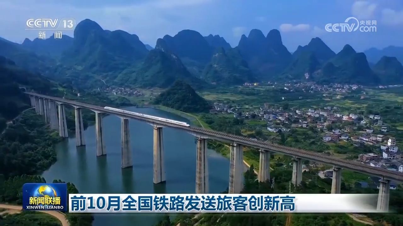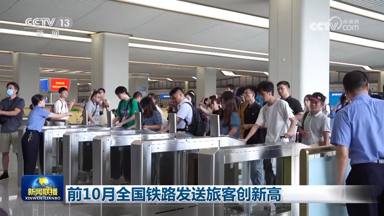 央视网消息(新闻联播):国铁集团最新数据显示,今年前十个月,全国铁路累计发送旅客近33亿人次,创历史新高。