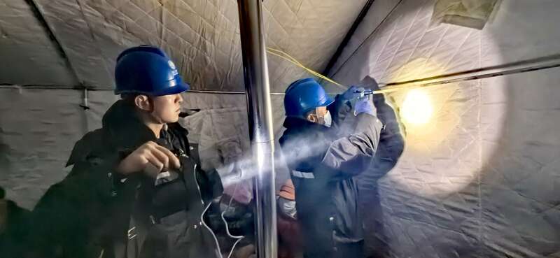 国网临夏供电公司工作人员在积石山县大河家镇震区救治点给帐篷接电。受访者供图