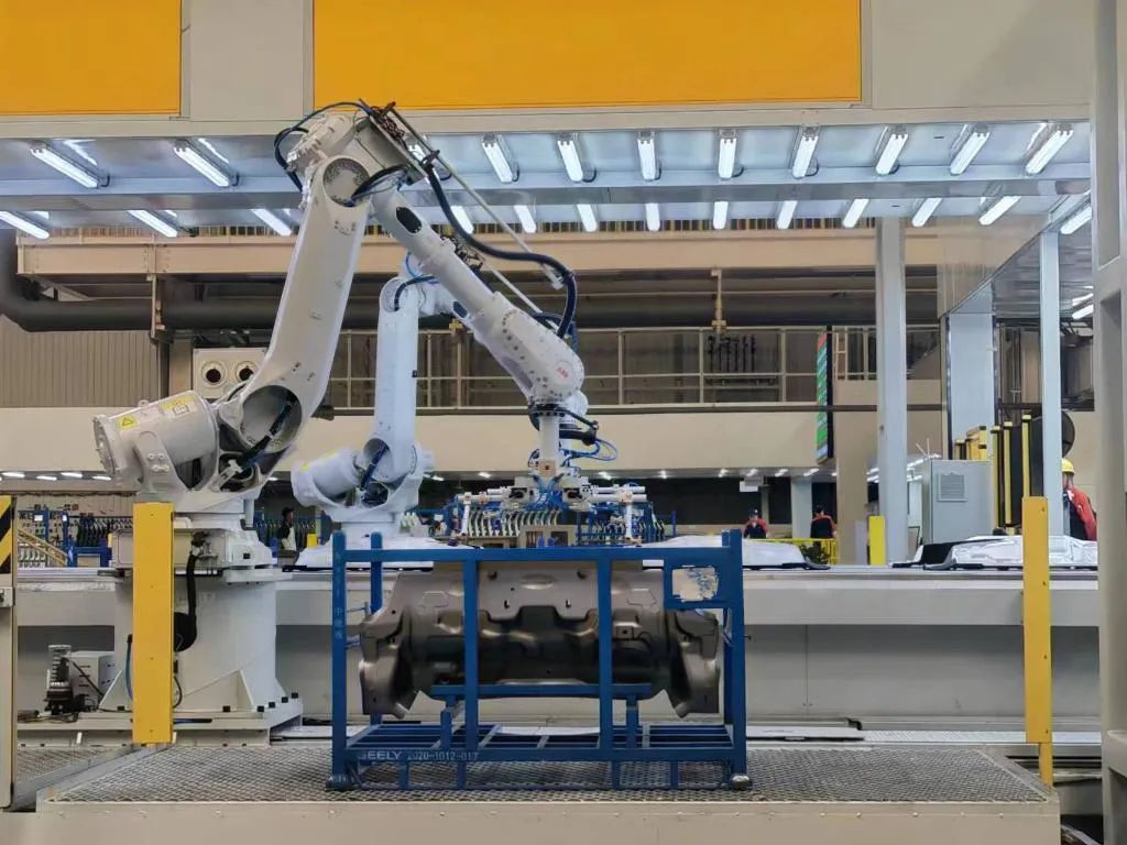 △陕西某品牌汽车工厂冲压车间机器人正在自动抓件。