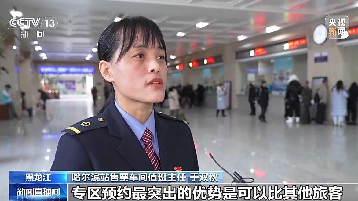 哈尔滨站售票车间值班主任 于双秋:专区预约最突出的优势是可以比其他旅客至少提前两天以上购买车票。根据咱们专区预约的购票规则,只要是符合购票条件的学生和务工人员,想购买春运期间的火车票,可预约开车前17天含以上的车票,而其他的旅客,则只能够买到开车前15天的车票。