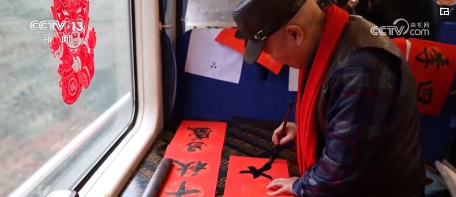 春节临近,列车的车厢装扮一新。铁路部门还邀请了书法爱好者给旅客们写春联、送福字,为大家送出新春祝福。