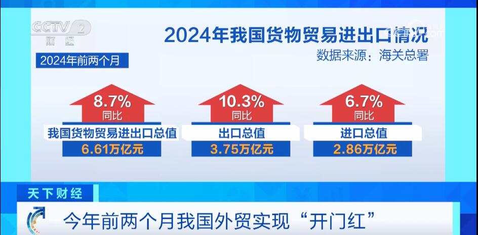 央视网消息:海关总署3月7日发布,今年前2个月,我国货物贸易进出口同比增长8.7%,出口更是达到两位数增长,外贸实现“开门红”。