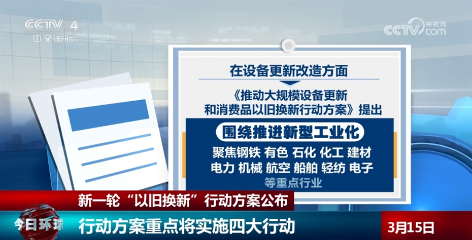 《行动方案》明确,重点实施设备更新、消费品以旧换新、回收循环利用、标准提升四大行动。