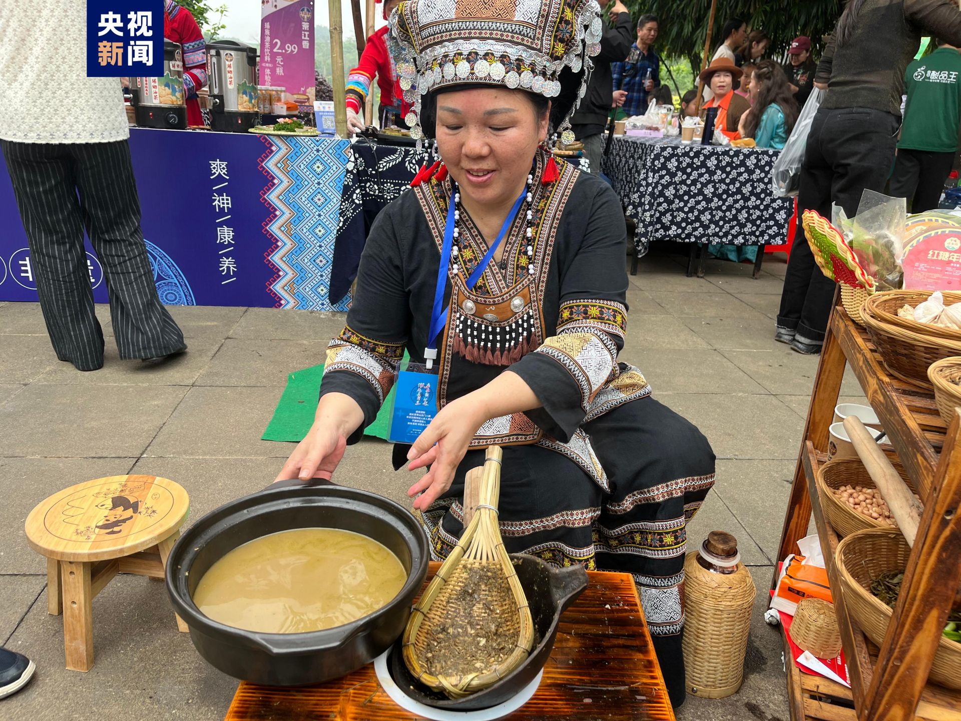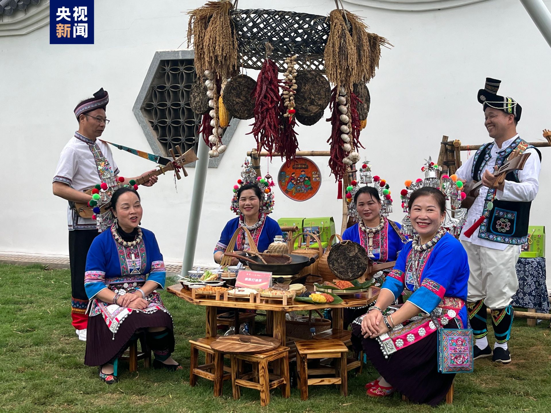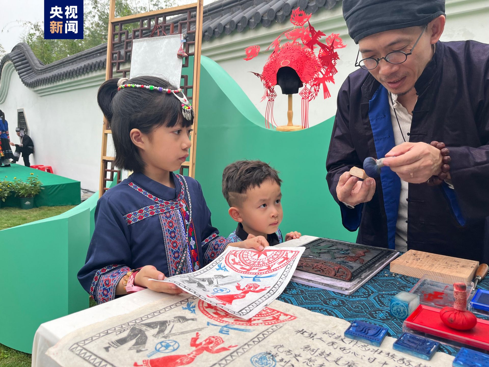 在非遗拓印展示摊位前,祈求风调雨顺的铜鼓、载歌载舞的壮族男女、寓意多子多福的青蛙等图案“跃然纸上”。“锦绣广西”村寨展示单元则重点还原壮锦技艺、蜡染扎染等场景,展示丰富多彩的广西织锦刺绣。还有非遗传承人现场制作瑶族油茶,天琴、独弦琴、马骨胡等广西传统乐器的演奏让现场民众尽情感受广西的天籁。