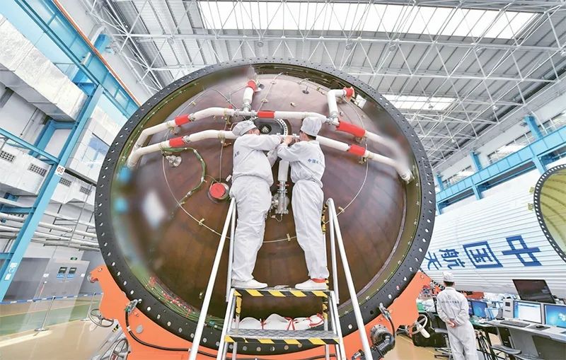 在以习近平同志为核心的党中央坚强领导下,各行各业劳动者砥砺奋进,用汗水浇灌收获,以实干笃定前行,在全面建设社会主义现代化国家新征程上书写奋斗新篇章。图为2023年4月19日,在航天科技集团一院天津火箭公司总装测试车间,班组人员在进行火箭装配。新华社记者 孙凡越/摄