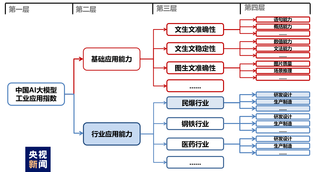指数体系由大模型基础应用能力与行业应用能力构成。大模型基础应用能力包含文生文、图生文等领域的准确性、稳定性能力;大模型的行业应用能力包含民爆、电力、石化、钢铁、医药等重点行业大模型在研发设计、生产制造、运维管理等环节具体场景的应用有效程度。