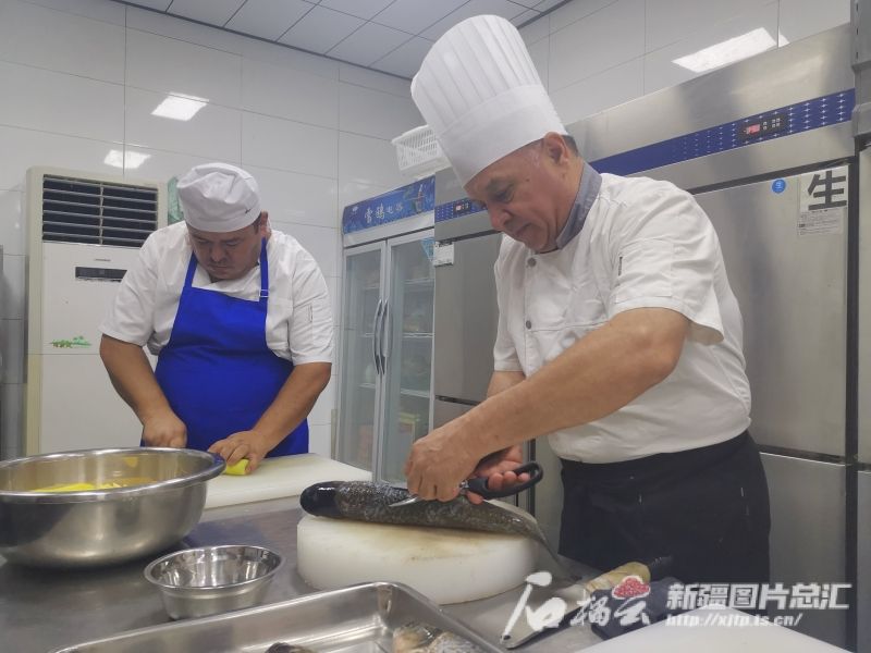 7月8日,野马集团有限公司引进的国际人才乌兹别克斯坦厨师阿不诺·艾合买提(右一)在工作中。石榴云/新疆日报记者赵悦摄
