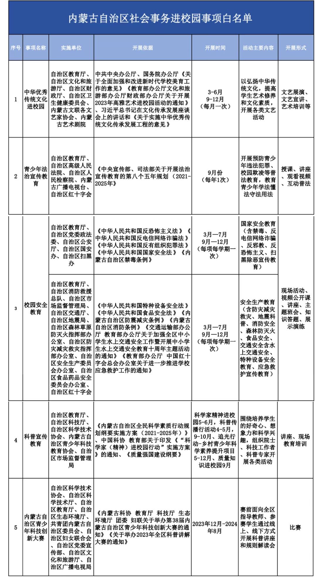 《内蒙古自治区社会事务进校园白名单》近日公布,未列入“白名单”管理的事项,一律不得进入校园
