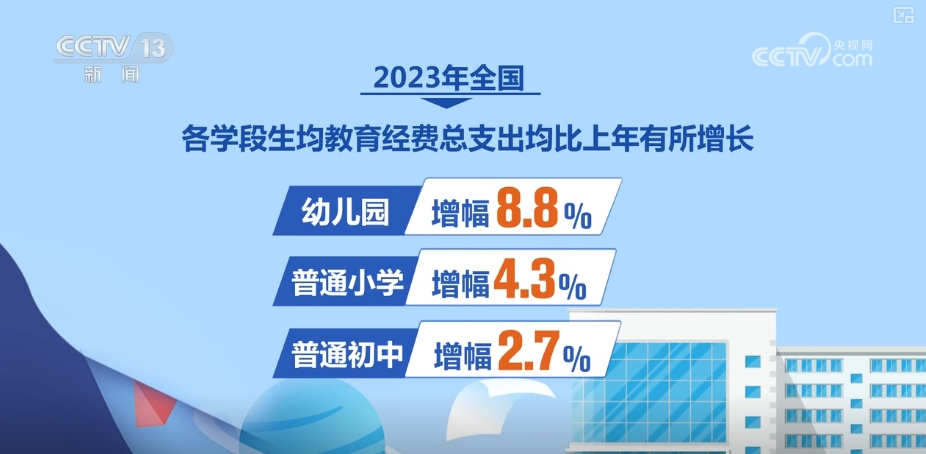 2023年,全国幼儿园、普通小学、普通初中、普通高中、中等职业学校、普通高等学校生均教育经费总支出均比上年有所增长,增幅分别为:8.8%、4.3%、2.7%、3.8%、0.7%、3.9%。