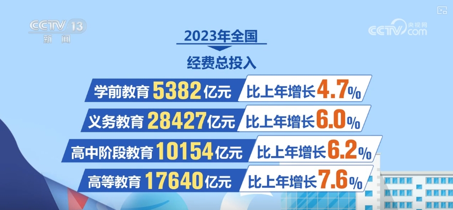 2023年,全国学前教育、义务教育、高中阶段教育、高等教育经费总投入分别为5382亿元、28427亿元、10154亿元、17640亿元,比上年分别增长4.7%、6.0%、6.2%、7.6%。