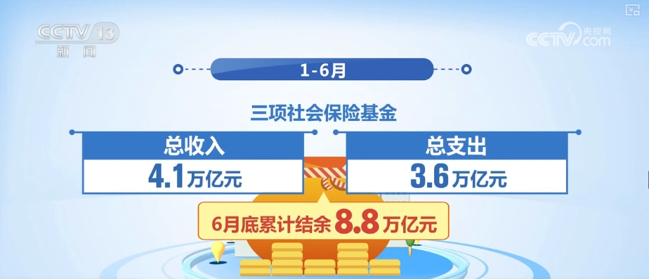 在7月23日的发布会上,人力资源社会保障部有关负责人介绍,1—6月份,三项社会保险基金总收入4.1万亿元、总支出3.6万亿元,6月底累计结余8.8万亿元,基金运行总体平稳。