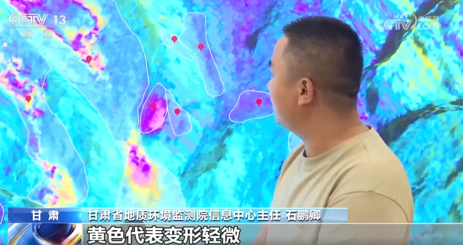 甘肃省地质环境监测院信息中心主任石鹏卿介绍:“我们首先利用雷达卫星获取了地表形变信息,像这一块区域,我们可以看到它有明显的变形区域,紫红色代表变形明显,黄色代表变形轻微。”