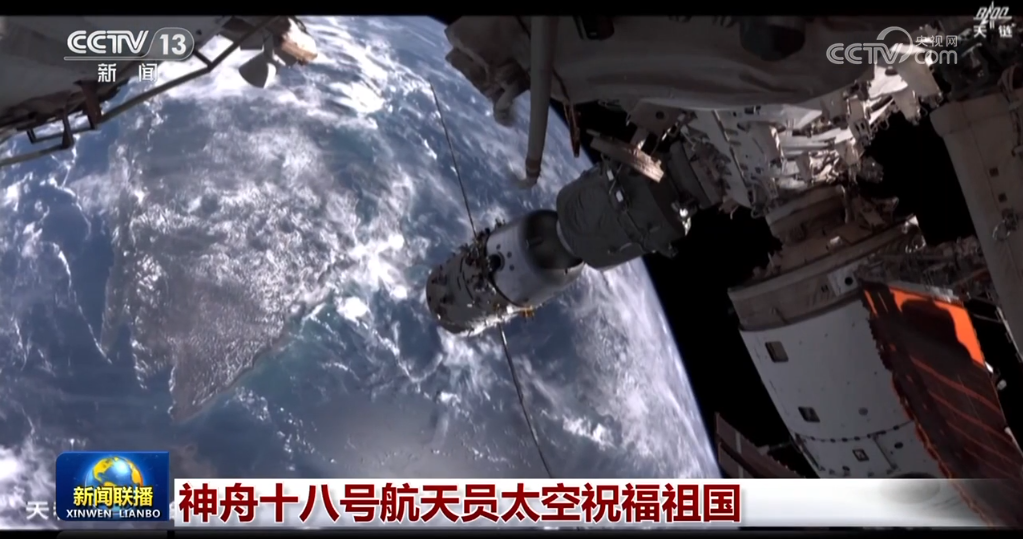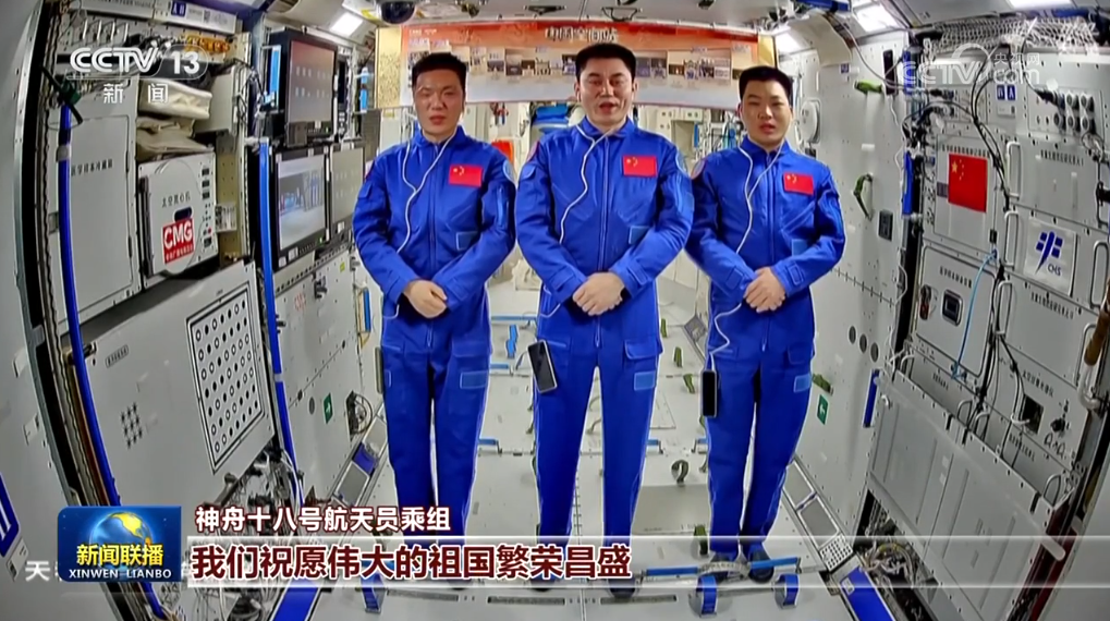 10月1日,神舟十八号航天员叶光富、李聪、李广苏,在中国空间站为祖国送上来自太空的祝福。