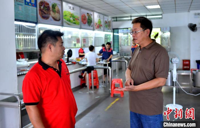 台胞庄书贤(右)与企业食堂员工交流。中新社记者 吕明 摄