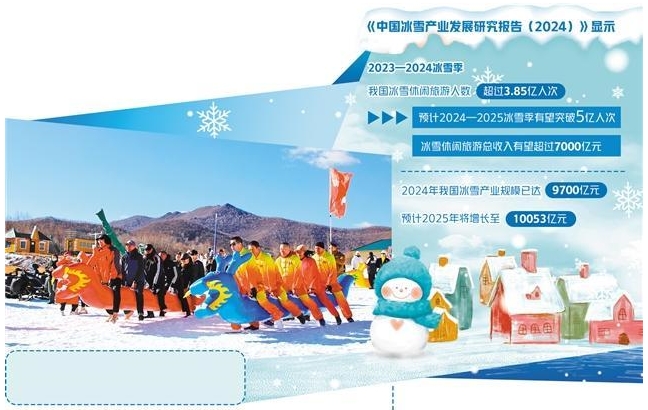 随着冬季来临,欣赏冰雪风光、参与冰雪运动、体验冰雪民俗等活动不仅极大丰富了群众的冬日生活,更成为驱动经济增长的新动力。《中国冰雪产业发展研究报告(2024)》显示,2023—2024冰雪季,我国冰雪休闲旅游人数超过3.85亿人次,预计2024—2025冰雪季有望突破5亿人次,冰雪休闲旅游总收入有望超过7000亿元。各地积极行动,结合本地特色,因地制宜创新“冰雪+”新业态模式,冰雪经济正以蓬勃的活力书写经济发展的新篇章。