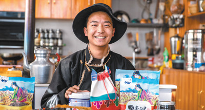 四川省甘孜藏族自治州甲洼镇,当地青年在展示直播售卖的商品。越来越多年轻人扎根家乡,为川藏公路沿线发展注入活力。 |