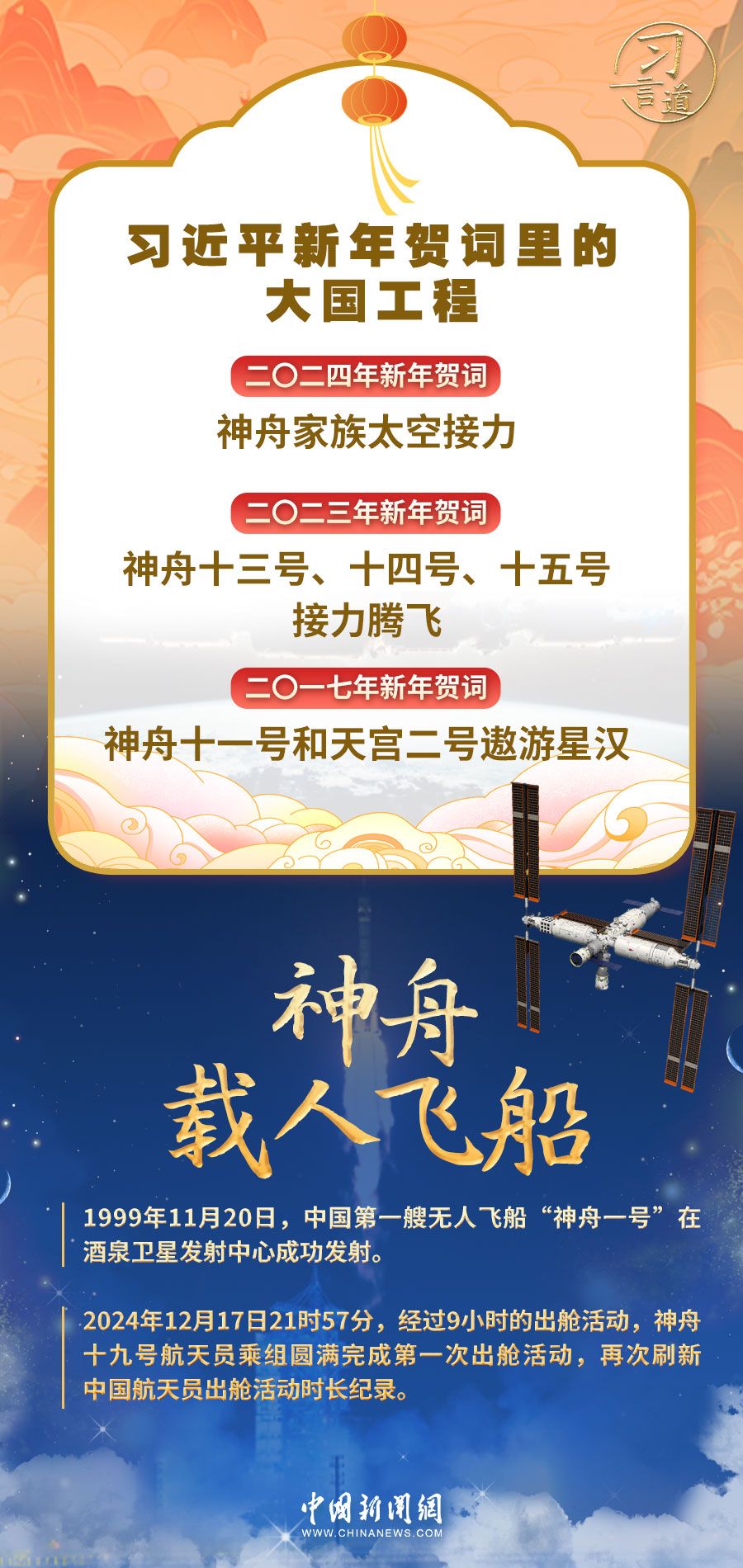 习近平主席在二〇二五年新年贺词中,为中国人逐梦星辰大海的豪情壮志喝彩。新年之际,让我们一起重温习近平主席在新年贺词中点赞的大国工程。