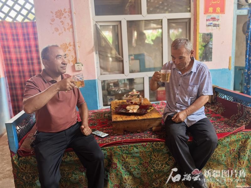 院中小桌上,茶杯里盛着金黄透亮的茶。“以前烧水放半块砖茶,只为盖住苦咸味。现在一小撮茶叶就满院香。”麦合木提感慨。这茶香,是生活品质的见证。