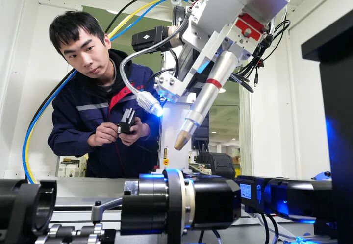 2025年1月7日,浙江省绍兴市上虞区浙江创新激光设备有限公司技术人员在调试四轴联动工作台激光焊接机。新华社记者 翁忻旸 摄