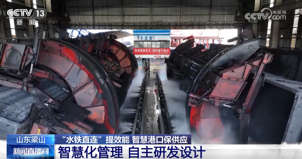 在现场,大家可以看到大型起重机正在往船上装集装箱,这是今年港口新推出的一种“水铁直连”的煤炭运转模式,就是把集装箱的煤通过铁路运到这里,不再经过卸煤和存储的过程,而是通过精准的需求调度把集装箱直接装船,通过运河发往目的地。这种方式大幅缩短了煤炭运输的周期,把整个周期从5天缩短到3天,也提升了港口能源保障的效率和能力。