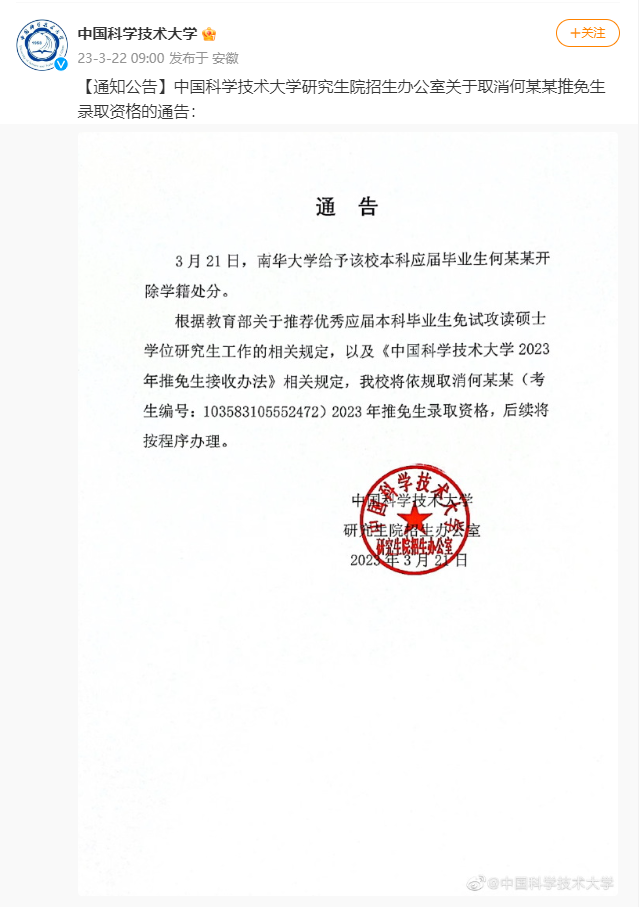 央视网消息:3月22日,@中国科学技术大学 研究生院招生办公室发布关于取消何某某推免生录取资格的通告:3月21日,南华大学给予该校本科应届毕业生何某某开除学籍处分,根据相关规定,中国科学技术大学将依规取消何某某2023年推免生录取资格,后续将按程序办理。