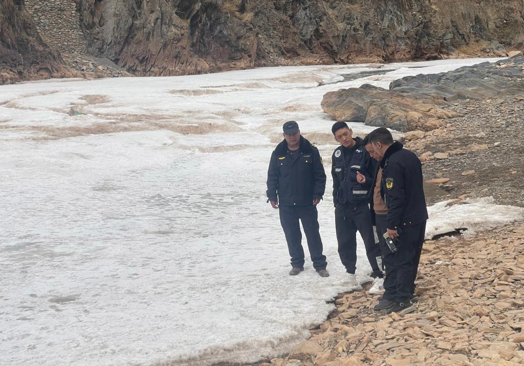 3月10日,在青海省玉树藏族自治州曲麻莱县麻多乡,县级监督员、乡级管理员、村级护鱼员正在黄河边巡查巡护。(受访对象供图)