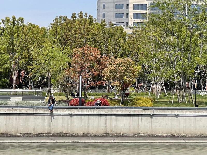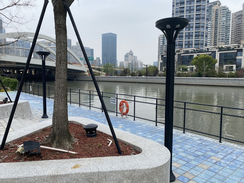 继续向西走,从中山公园到泸定路桥这段,除了几个码头配有救生圈等设备,沿途几乎看不到什么救生设施。在靠近泸定路桥的河边,记者看到,有人坐在堤岸上垂钓,两只脚荡在空中,没有任何围栏。离他最近的游船码头,走路至少要15分钟。一位来此散步的居民告诉记者,她曾目睹孩子玩水鞋子掉进河里的情景,“孩子想去捞鞋,要不是父母及时制止,可能也会掉进河里,而附近没有任何救援”。