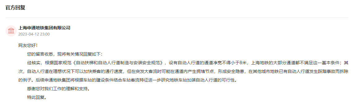 “将根据车站的建设条件结合车站客流特征进一步研究地铁车站加装自动人行道的可行性……”4月12日,上海申通地铁集团有限公司就网友通过人民网“领导留言板”留言关注的上海地铁换乘的问题作了详细回复。