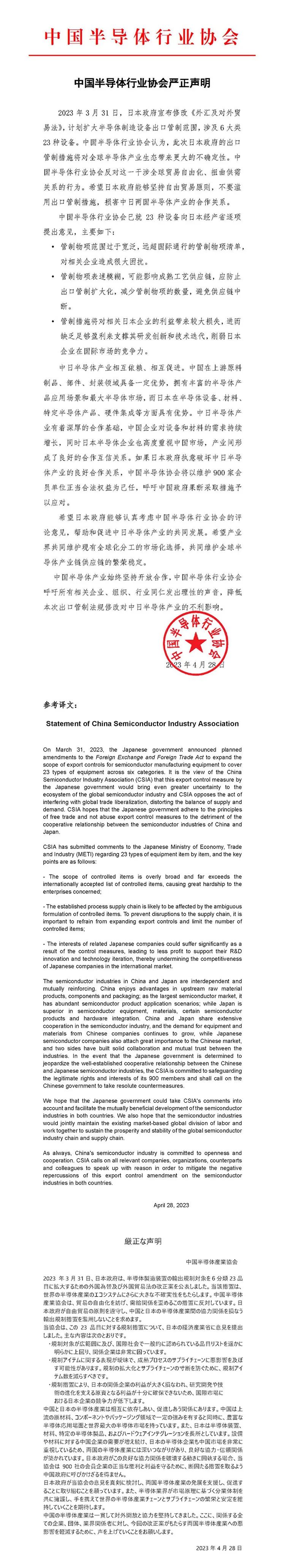 2023年3月31日,日本政府宣布修改《外汇及对外贸易法》,计划扩大半导体制造设备出口管制范围,涉及6大类23种设备。中国半导体行业协会认为,此次日本政府的出口管制措施将对全球半导体产业生态带来更大的不确定性。中国半导体行业协会反对这一干涉全球贸易自由化、扭曲供需关系的行为。希望日本政府能够坚持自由贸易原则,不要滥用出口管制措施,损害中日两国半导体产业的合作关系。
