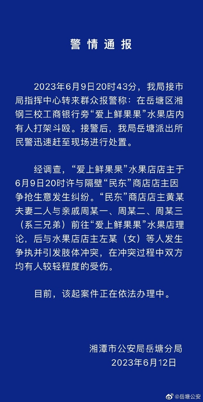央视网消息:据@岳塘公安 微博消息,6月9日20时43分,湖南湘潭市公安局岳塘分局接湘潭市局指挥中心转来群众报警称:在岳塘区湘钢三校工商银行旁“爱上鲜果果”水果店内有人打架斗殴。经调查,“爱上鲜果果”水果店店主于6月9日20时许与隔壁“民东”商店店主因争抢生意发生纠纷。“民东”商店店主黄某夫妻二人与亲戚周某一、周某二、周某三(系三兄弟)前往“爱上鲜果果”水果店理论,后与水果店店主左某(女)等人发生争执并引发肢体冲突,在冲突过程中双方均有人较轻程度的受伤。目前,该起案件正在依法办理中。