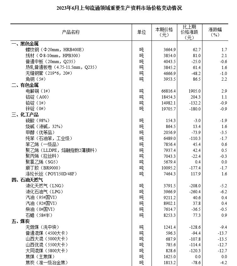 2023年6月上旬流通领域重要生产资料市场价格变动情况