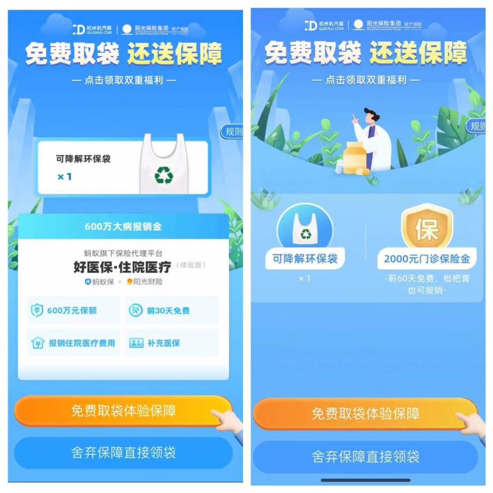 记者走访当天,这家医院门诊药房的两台“自助取袋机”并未投入使用。一名医生介绍,相关机器因缺袋已停用近两周,此前使用率很高,有不少市民吐槽“广告太多”,至于里面的保险,她并不清楚。随后,记者又前往奉贤区中医医院,发现外观一模一样的机器里投放的保险险种变成了好医保·门诊险(体验版)。此后蹲点的1个小时内,记者目睹了好几位市民“不小心”购买了保险的经历。一对年轻夫妇和中年女士拿完药后,用支付宝扫码取袋,仓促间选择点击了“免费领取体验保障”,根据引导购买了保险后获取了免费的环保袋,整个过程用时不足1分钟,市民完全未意识到自己已经购买了保险。还有3位年轻市民,使用支付宝扫码后选择了“免费领取体验保障”,发现有其他附加条件才能取袋,直接转身离开。
