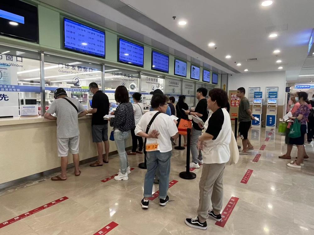 上午10时,第四人民医院门诊药房,市民正排队领药。
