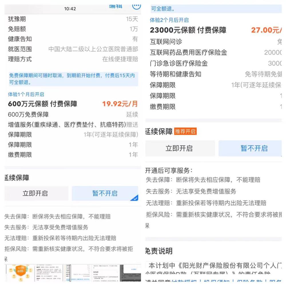 7月18日上午,在上海市第四人民医院急诊药房旁,记者看到了所谓的“自助取袋机”。一台蓝、白、黄相间的机器上,“支付宝扫码、首个免费”的提示格外明显,屏幕上还展示了扫码取药的全流程。记者根据提示打开支付宝扫码,页面随即跳转到取袋界面,“免费取袋、还送保障”的广告铺满了整个屏幕,“前30天免费”的提醒则被囊括在可享受的权益中。屏幕下方,两个按钮的设置极具迷惑性:相较于最底部标注着“舍弃保障直接领袋”的蓝色按钮,上方手指图标指向的黄色按钮更为显眼,连同“免费取袋体验保障”几个字成了整个屏幕的视觉中心,点击后就进入了“好医保·住院医疗(体验版)”的投保界面。由于支付宝关联了个人信息,记者只需不断点击下一步即可,最后总算领取到了一个环保袋。值得注意的是,在输入密码成功投保后,界面又跳转至延续保障服务,后续投保每月还需再付19.92元,又是一蓝一白两个按钮,不仔细看很容易就会点击开启“自动扣费”的蓝色按钮。