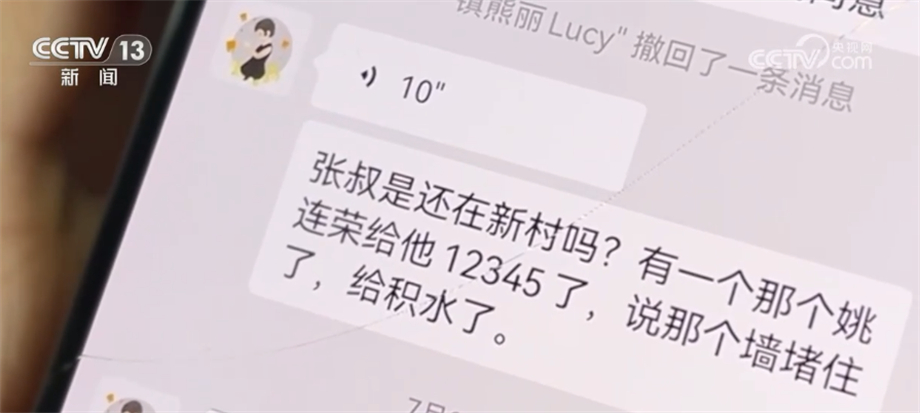 熊丽生前的微信语音:宗叔,是还在新村吗?有一个姚连荣打12345了,说那个墙堵住了,给积水了。