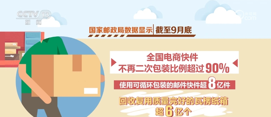 国家邮政局数据显示,截至9月底,全国电商快件不再二次包装比例超过90%,使用可循环包装的邮件快件超8亿件,回收复用质量完好的瓦楞纸箱超6亿个。