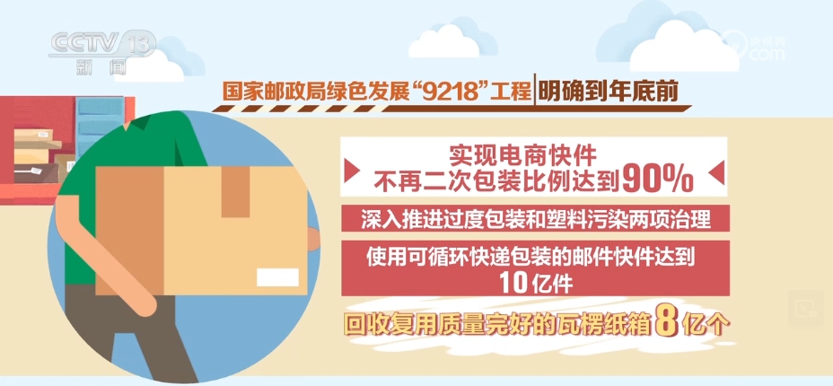 2023年年底前,按照国家邮政局实施的绿色发展“9218”工程要求,电商快件不再二次包装比例将达到90%,深入推进过度包装和塑料污染两项治理,使用可循环快递包装的邮件快件达到10亿件,回收复用质量完好的瓦楞纸箱8亿个。