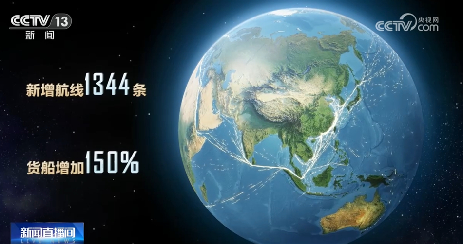 向大海,这是2013年时中国与共建“一带一路”国家间的水运航线。十年间,共建“一带一路”国家间的水运航线数量翻了一番,新增航线达到了1344条,穿梭其中的货船增加150%。“丝路海运”航线已通达全球43个国家的117个港口,织出了一张联通世界的贸易流动网络。