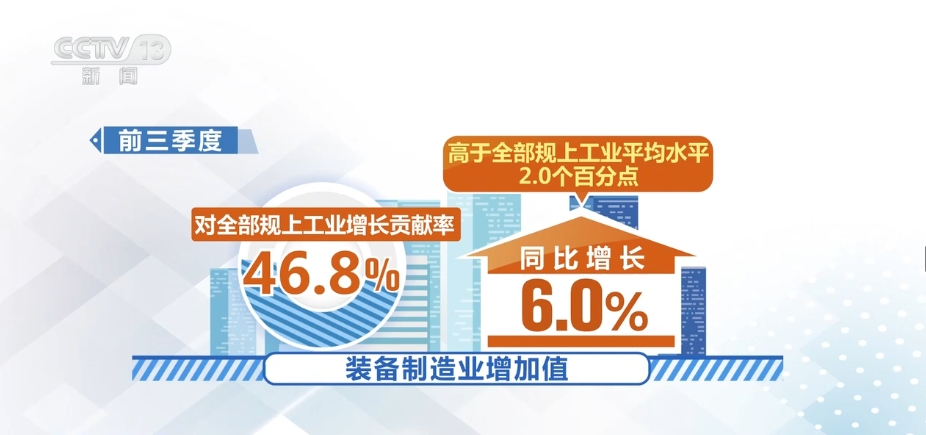 前三季度,在工业41个大类行业中,27个行业增加值实现增长,增长面达65.9%。其中,装备制造业增加值同比增长6.0%,高于全部规上工业平均水平2.0个百分点,对全部规上工业增长贡献率达46.8%。
