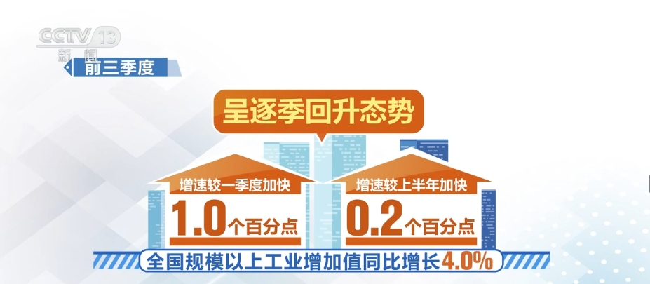 前三季度,全国规模以上工业增加值同比增长4.0%,增速较一季度、上半年分别加快1.0、0.2个百分点,呈逐季回升态势。其中,制造业同比增长4.4%,高于整个工业的增速水平。