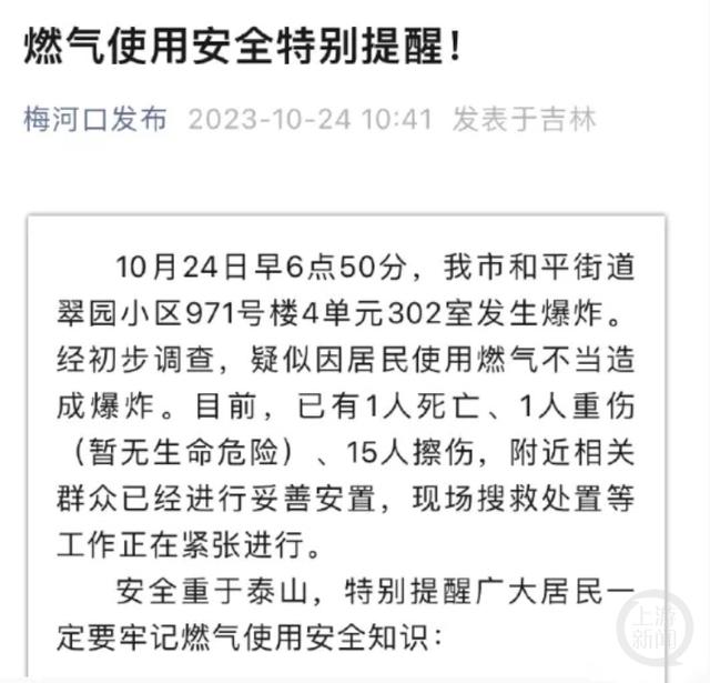 10月24日上午,梅河口市委宣传部官方公众号“梅河口发布”就此事发布消息,10月24日早6点50分,梅河口市和平街道翠园小区971号楼4单元302室发生爆炸。经初步调查,疑似因居民使用燃气不当造成爆炸。目前,已有1人死亡、1人重伤(暂无生命危险)、15人擦伤,附近相关群众已经进行妥善安置,现场搜救处置等工作正在紧张进行。
