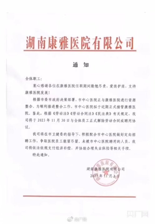 11月1日晚,湖南益阳康雅医院发布一则通知,鉴于益阳市中心医院近期将正式接管康雅医院,决定于11月30日和全体员工正式解除劳动或聘用协议。