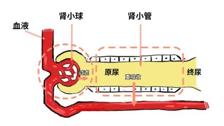 重吸收车间的主力员工是肾小管,它会根据人体的实时情况,对原尿中的物质进行一一排查,把有利于人体的物质,如葡萄糖、氨基酸和99%的水重新回收到血液里,剩下的形成最终的尿液。