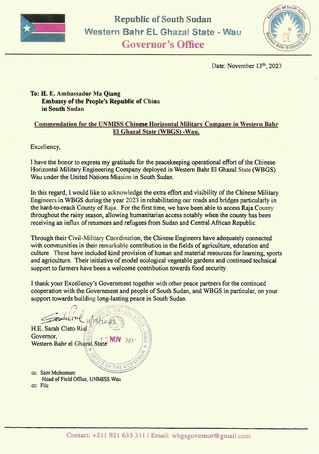 人民网内罗毕11月24日电(黄炜鑫、通讯员广志勇)瓦乌消息:南苏丹西扎勒河州州长莎拉·哈桑女士近日向中国驻南苏丹大使馆发感谢信,感谢部署在联合国驻南苏丹特派团(联南苏团)瓦乌基地的中国第13批赴南苏丹(瓦乌)维和工兵分队为当地经济社会发展作出的突出贡献。