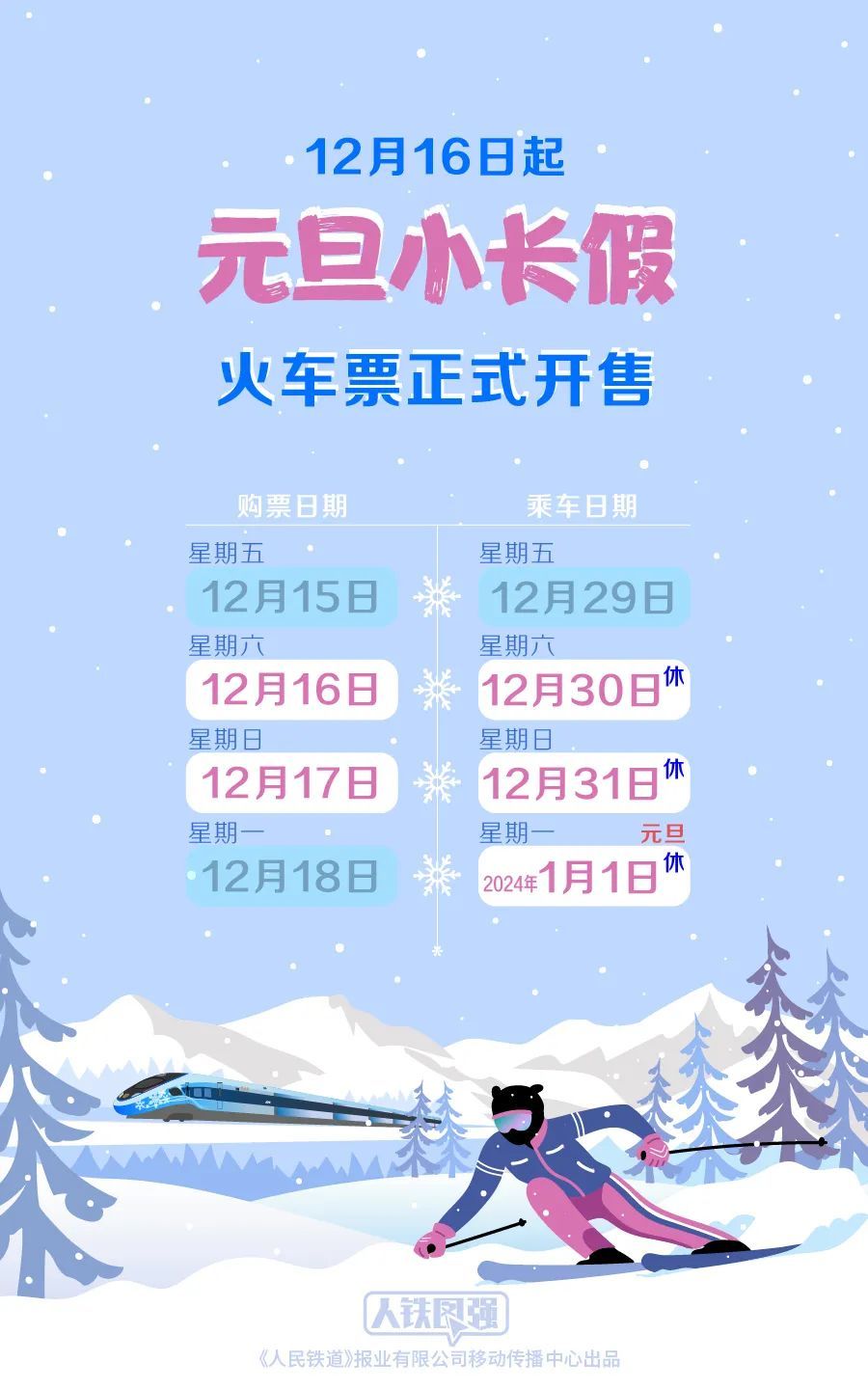 按照15天车票预售期规定,元旦小长假首日(12月30日)火车票将于12月16日开售,12月31日火车票于12月17日开售,元旦当天火车票于12月18日开售。