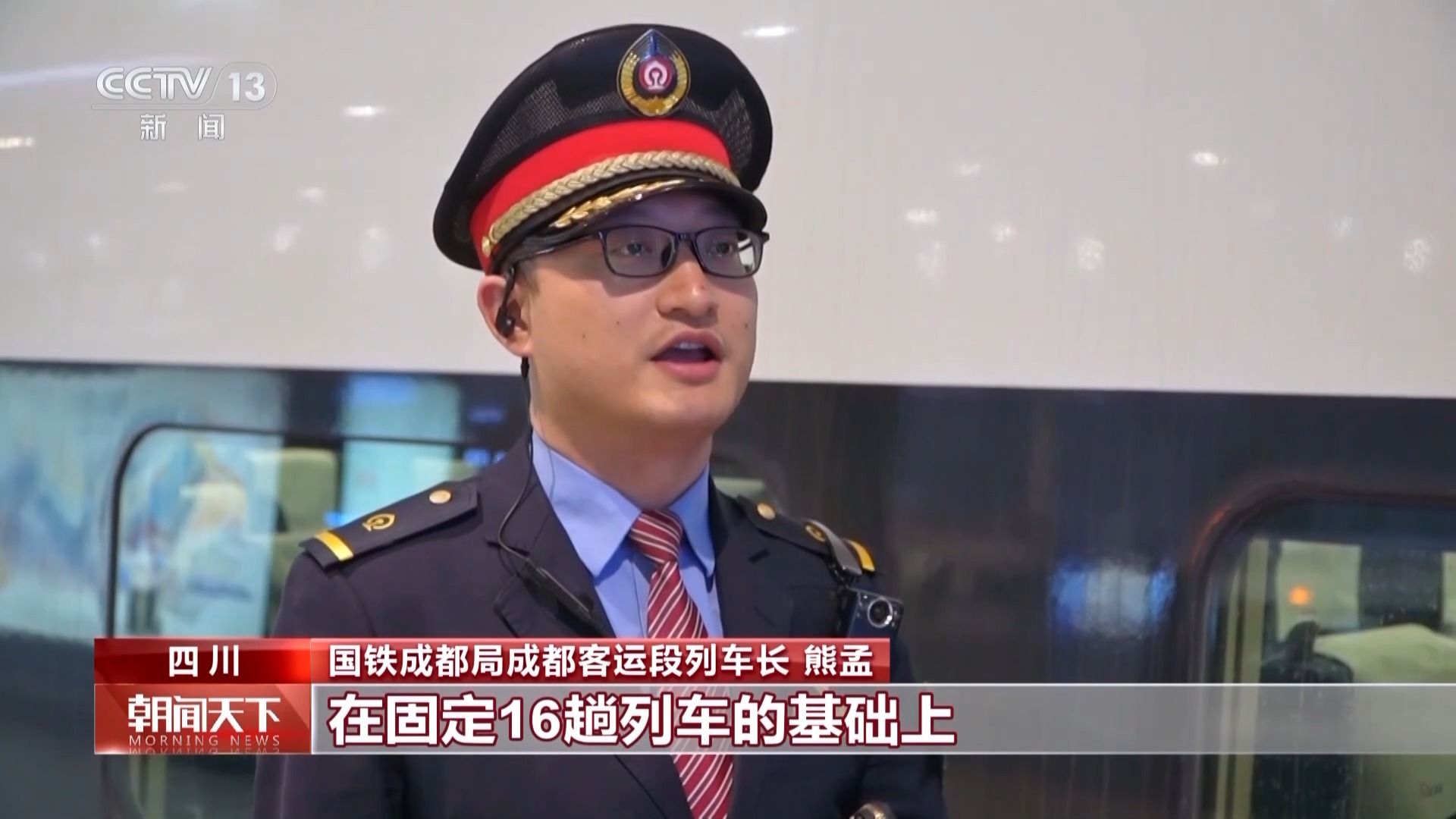 国铁成都局成都客运段列车长 熊孟:针对大客流,在固定16趟列车的基础上,增加了2趟,满足假日期间旅客运输。