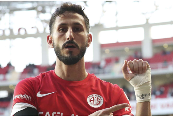 综合上述媒体报道,在14日土耳其足球超级联赛“安塔利亚体育”对阵“特拉布宗体育”俱乐部比赛中,庆祝扳平比分的“安塔利亚队体育”28岁以色列球员耶赫兹克尔对着镜头比心并展示手腕上的绷带,上面写着“100天 10月7日”,并附带一个“大卫之星”标志。