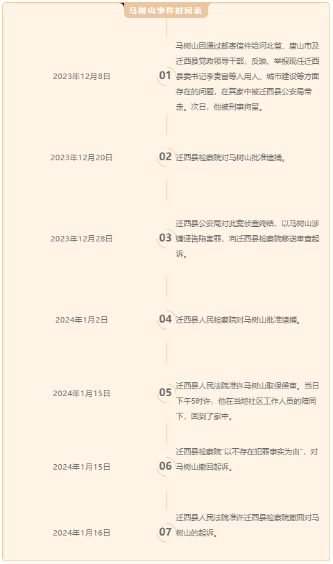 事件被媒体曝光之后,今年1月15日,迁西县检察院以“不存在犯罪事实”为由,对马树山撤回起诉,同日马树山被释放。