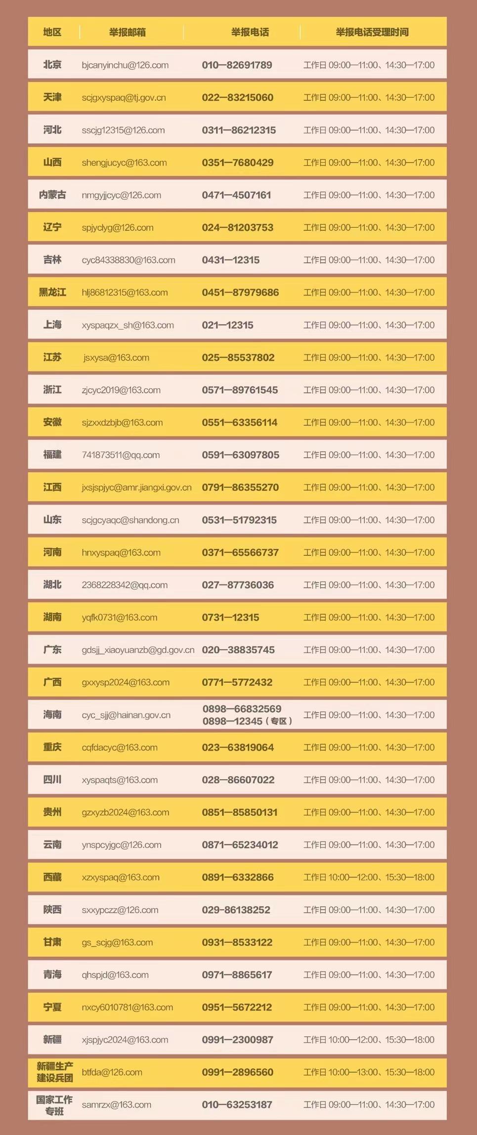 记者今天(19日)从国务院食安办获悉:按照国务院食安办、教育部、公安部、国家卫生健康委、市场监管总局联合印发《校园食品安全排查整治专项行动实施方案》有关要求,国家和各地分别开通校园食品安全排查整治专项行动举报邮箱和电话,鼓励广大师生和家长开展社会监督。集中整治期间(截至2024年6月)各地的举报邮箱、举报电话公布如下: